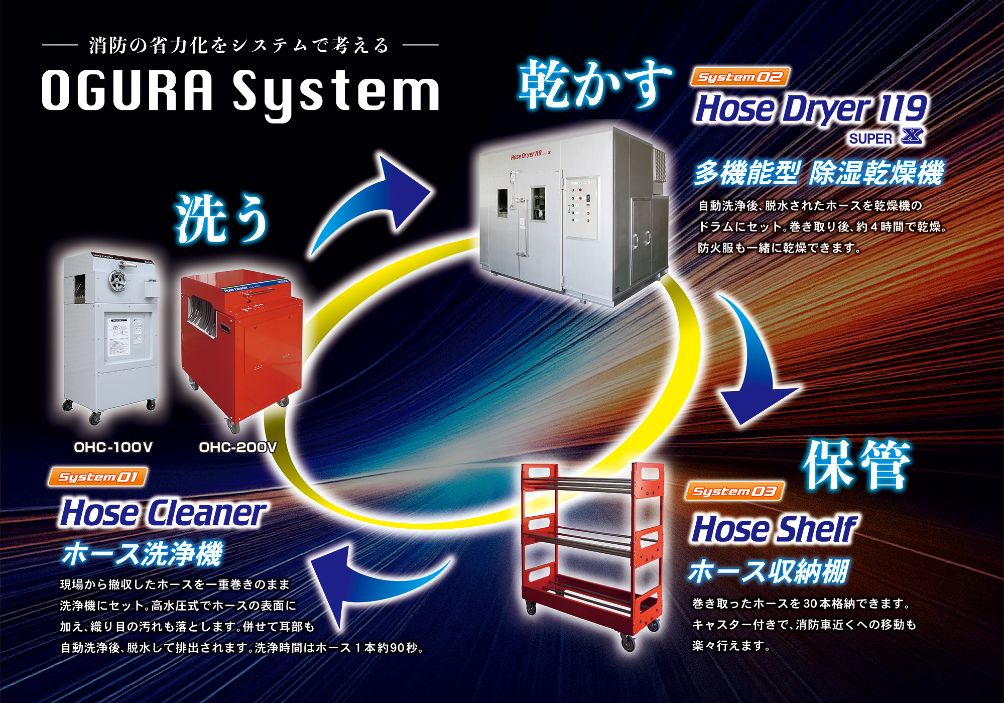 消防ホースの『洗浄』『乾燥』『保管』を目的とし、長年にわたり手がけてきた“OGURA SYSTEM”の総発売元です。